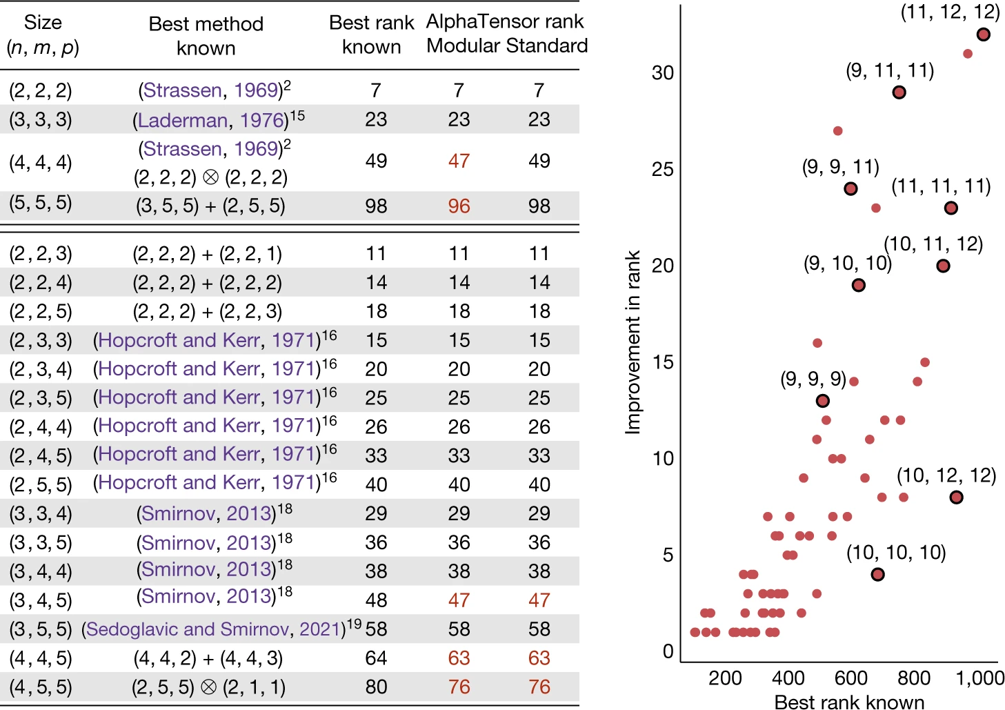 $$ P_1 = (A_{11} + A_{22})(B_{11} + B_{22}) $$ $$ P_2 = (A_{21} + A_{22})B_{11} $$ $$ P_3 = A_{11}(B_{12} - B_{22}) $$ $$ P_4 = A_{22}(B_{21} - B_{11}) $$ $$ P_5 = (A_{11} + A_{12})B_{22} $$ $$ P_6 = (A_{21} - A_{11})(B_{11} + B_{12}) $$ $$ P_7 = (A_{12} - A_{22})(B_{21} + B_{22}) $$